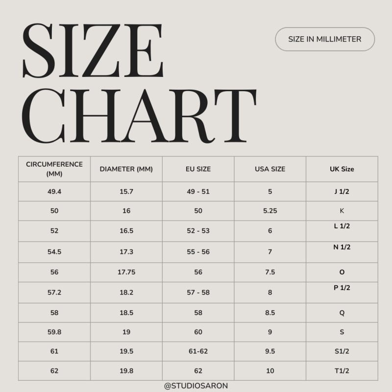 - Place the ring on a ruler and measure the inner diameter in millimeters.